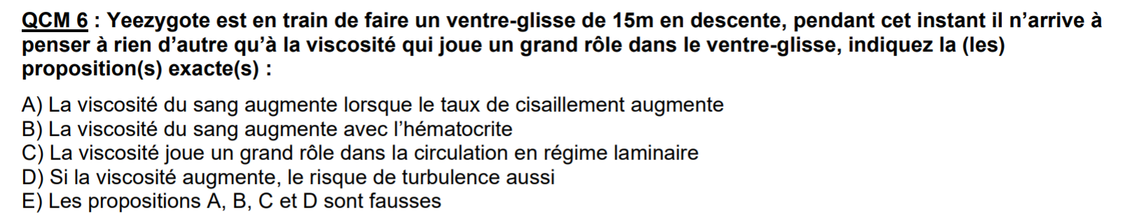L'item A est compté vrai mais c'est justement pas l'inverse ? Quand le taux de cisaillement = gradient de vitesse augmente la viscosité diminue non ?