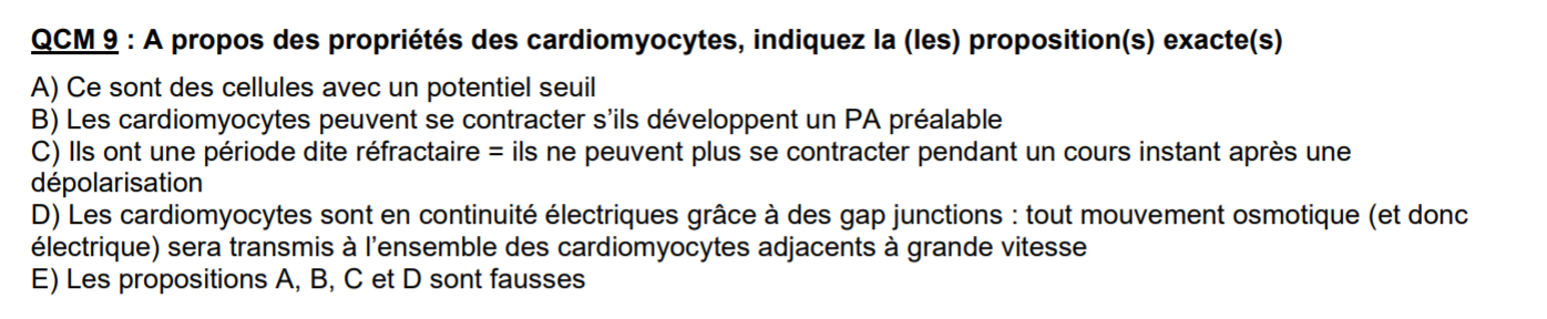 Pour la réponse que tu m'as donné pour l'item A, j'ai fortement l'impression qu'on parle de cellules nodales et non pas de cardiomyocytes. Pour moi ce sont les cellules nodales qui ont un potentiel seuil et une dépolarisation spontanée et non pas les CMY: on peut le voir sur le graphique.
