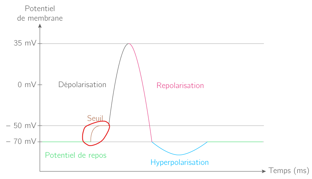 Donc on a des canaux voltages-dépendants, ce qui veut dire qu'on doit atteindre un certain potentiel pour les activer = potentiel seuil !