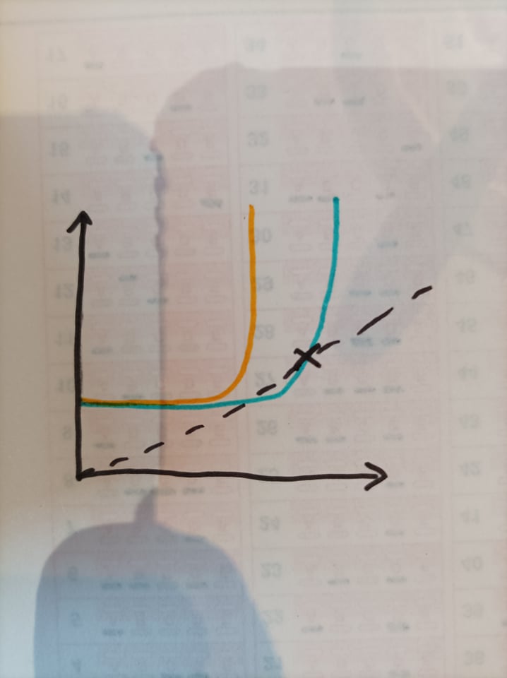En faisant le schéma au brouillon et en appliquant les modifications j'arrive quand même à trouver un point d'intersection entre les deux courbes et donc un rayon d'équilibre non-nul.