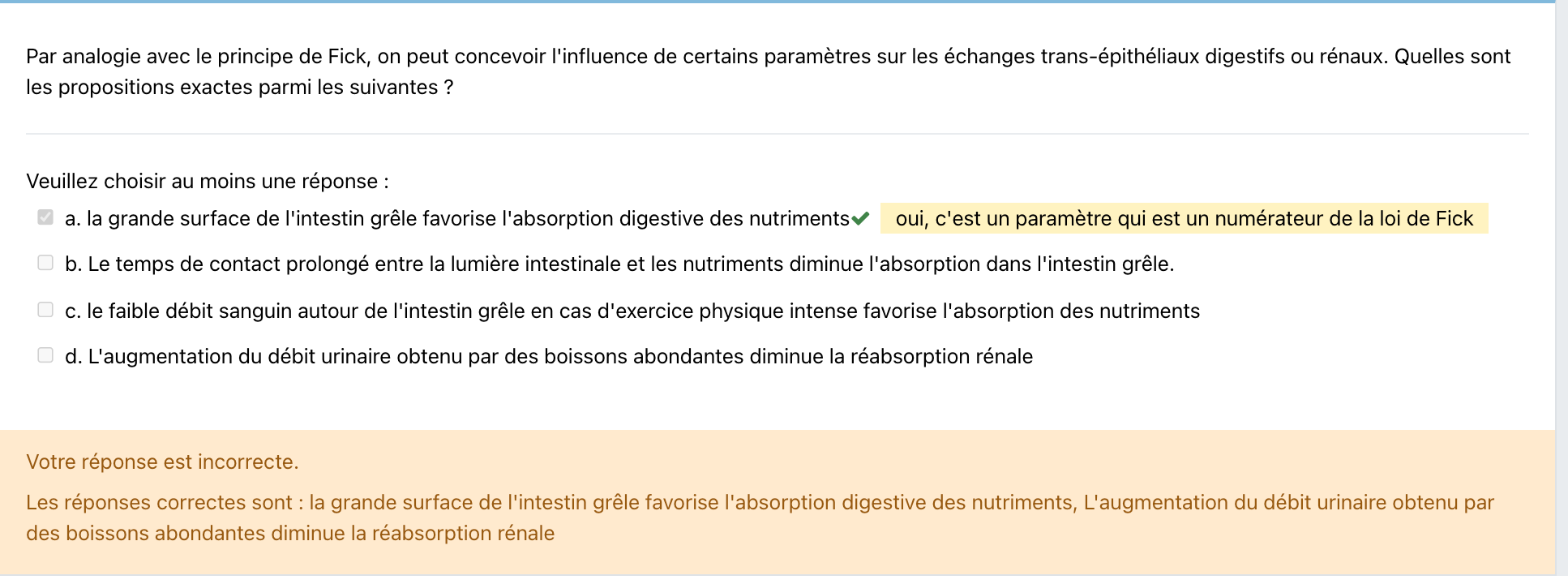 Concernant le QCM du prof, je ne comprends pas quel est le lien de la loi de Fick avec l'item D " l'augmentation du débit urinaire, obtenu par boissons abondantes, diminue la réabsorption rénale".