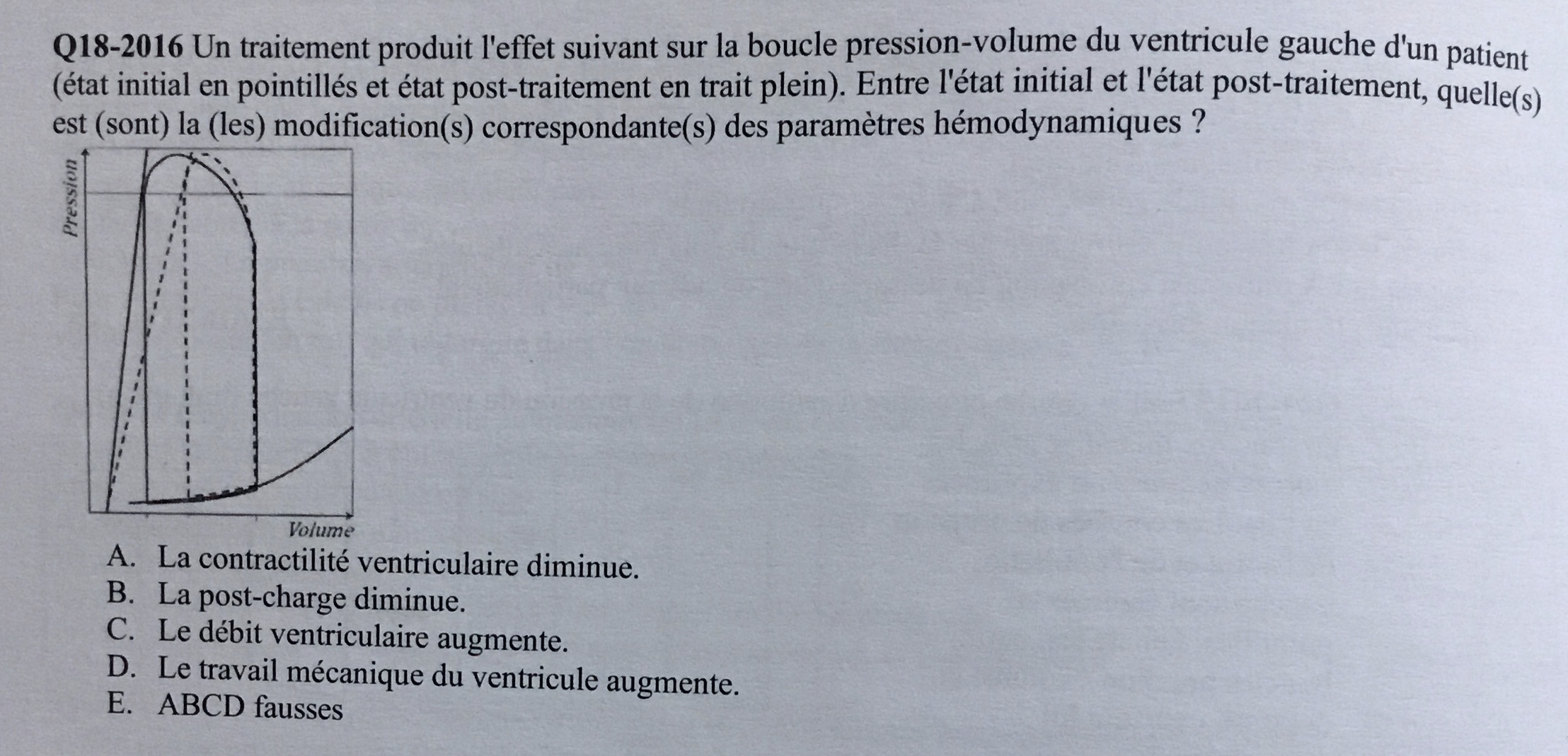 :arrow: Or on voit que les angles supérieurs droit et gauche (respectivement ouverture et fermeture de la valve aortique) se font à même pression sur le diagramme en pointillé et en trait plein donc pas de diminution de la post charge