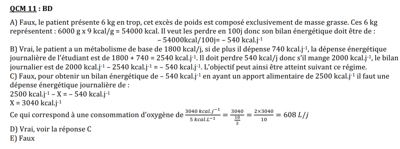 :idea: Aparté n°2, une chose importante à comprendre pour ces qcm c'est qu'on va avoir un apport alimentaire en kcal, auquel on va a enlever les dépenses énergétiques totales (dans celle ci il y a obligatoirement le métabolisme de base en plus d'autres dépenses généralement) pour obtenir le bilan énergétique