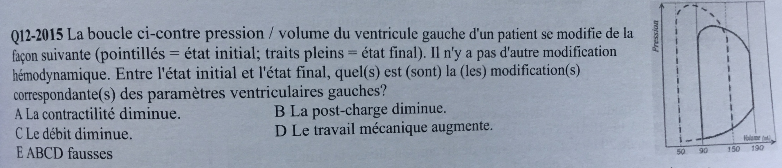Donc on nous dit que la boucle pression volume du ventricule gauche se modifie et on veut savoir donc quels paramètres ont été diminué/augmenté (on passe du trait pointillé en trait plein) :