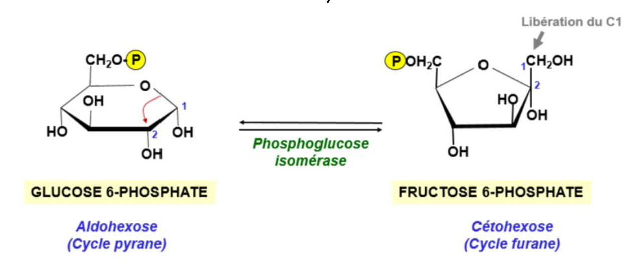 A : La deuxième étape de la glycolyse permet la transformation d’un aldohexose (cycle pyrane) à une cétohexose (cycle furane)