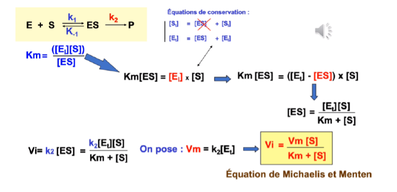 j'ai l'impression qu'il y a une incohérence entre la formule de la Vi dans l'encadré de la page 7 qui est égal au produit de k2, [Et] et [S] divisé par Km+ [S] et la valeur de Vi définie dans le texte en haut de la page 8 où la on parle du produit de k2, [Et] et [ES] divisé par Km+[S].. quelle est la version à retenir?