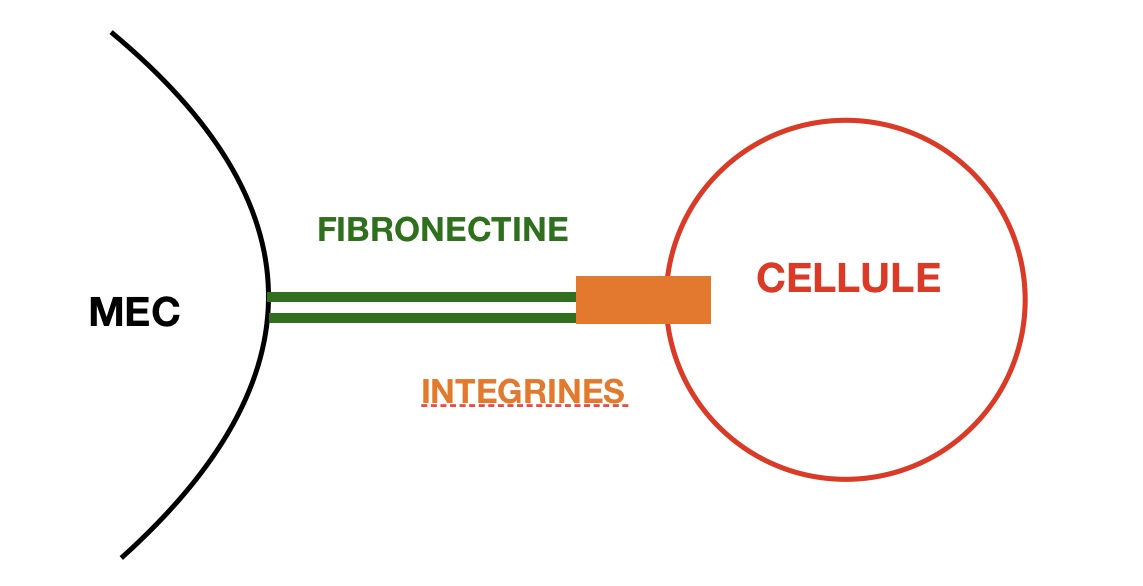 La fibronectine possède 2 extrémités; une reliée à la MEC et l’autre reliée à la cellule via les intégrines.