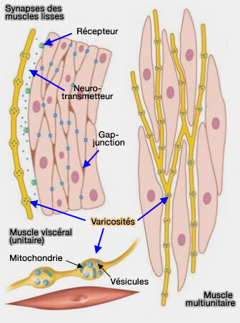 muscle lisse, il n'y a pas de synapse. Aux extrémités des neurones qui s'occupent du muscle lisse, il existe des renflements appelés