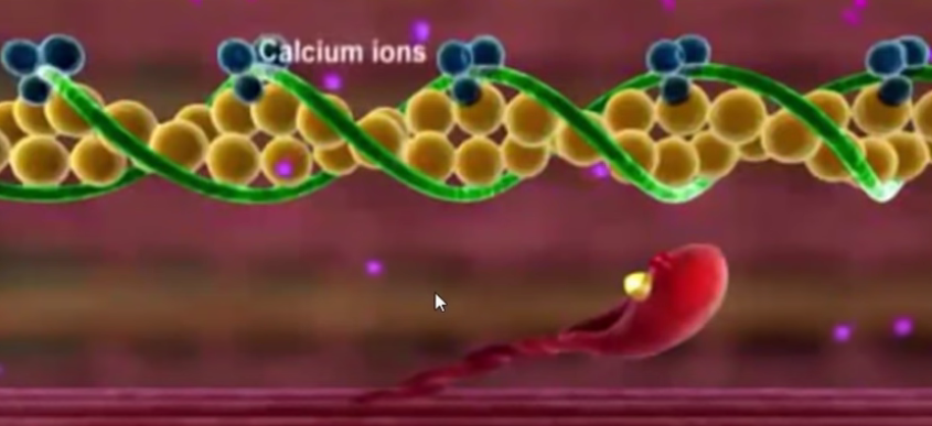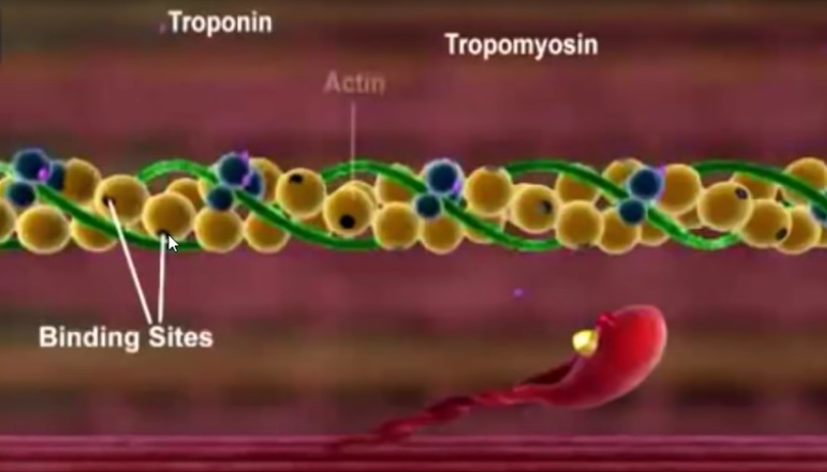 Une fois que le calcium se fixe sur la troponine C, le complexe de troponine entraîne une traction de la tropomyosine. Et tu vois qu'en dessous de la tropomyosine se trouvent les "binding sites" = les sites de fixation de la myosine.
