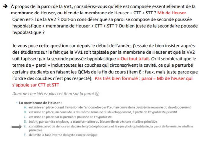 A propos de l'item E de ce QCM, si on avait plutôt "Constitue, avec de dehors en dedans le STT et le CTT, la paroi de la vésicule vitelline primitive" (j'ai inversé CTT et STT de l'item d'origine qu'il y a ci dessous) pourquoi est-ce qu'il serait compté vrai (selon la correction) ? Pour moi la VV1 est seulement "constituée" de la membrane de Heuser faite par la première poussée hypoblastique... Je suis assez confuse