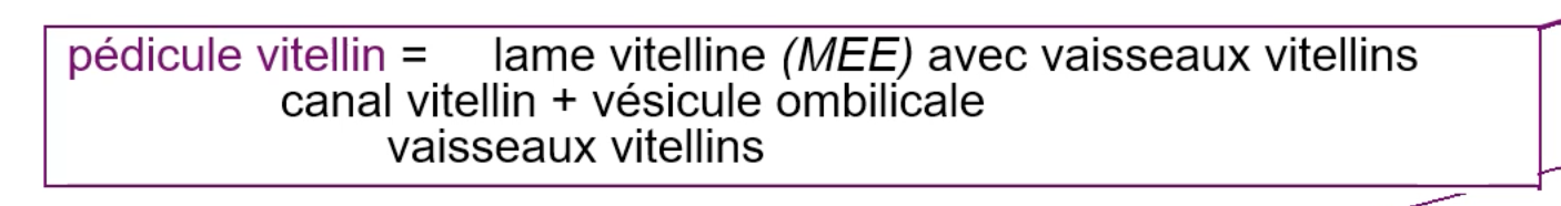Pédicule vitellin = Canal vitellin + Vsx vitellins + Lame vitelline + Vésicule vitelline/ombilicale