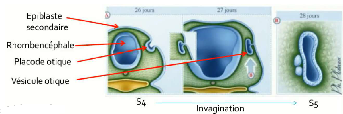 placodes otiques, puis ces placodes otiques s'enfoncent/s'invaginent pour s'internaliser et former la
