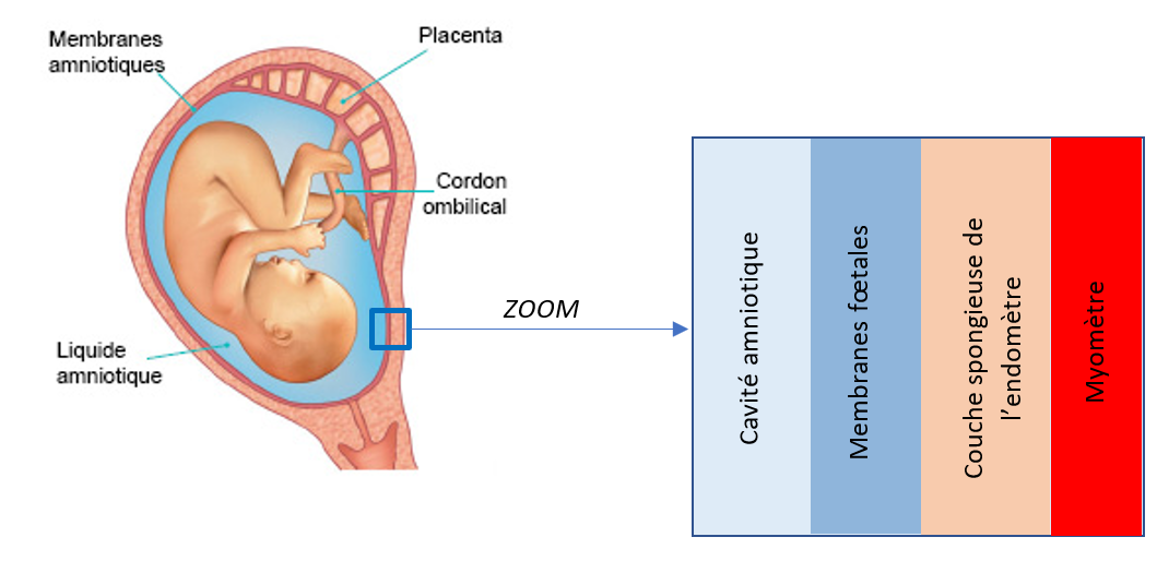 Ensuite, les membranes se situent entre la cavité amniotique et la couche spongieuse de l'endomètre (dire "endomètre" c'est ambiguë car ici on ne parle pas de la couche compacte de l'endomètre). Les membranes fœtales tapissent/bordent la cavité amniotique :