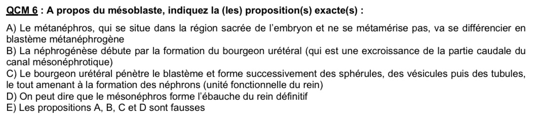 J’ai un soucis avec l’item A du QCM 6: « Le métanéphros, qui se situe dans la région sacrée de l’embryon et ne se métamérise pas, va se différencier en blastème métanéphrogène » VRAI