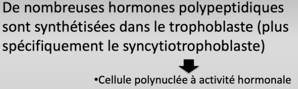 Avant dans le cours sur les hormones on disait "Pendant la phase de fixation, le trophoblaste commence à se différencier en syncytiotrophoblaste – cellule géante multinuclée – et en cytotrophoblaste"