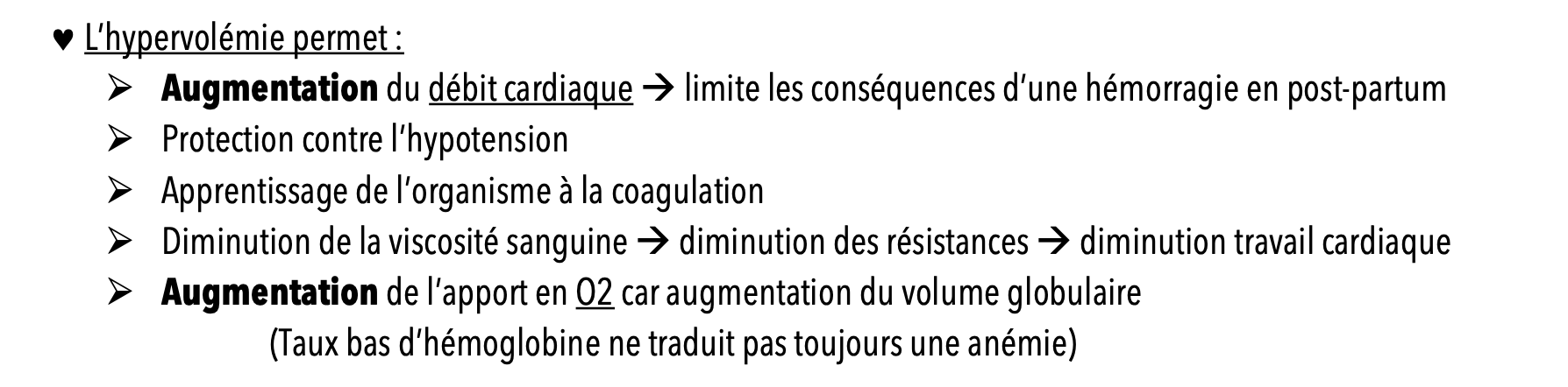 - L’hypervolémie limite les conséquences d’une hémorragie en post-partum immédiat