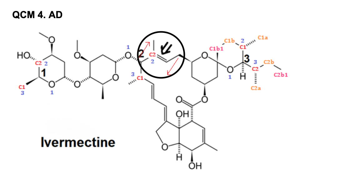 Concernant le QCM 4, en gros cette partie de la correction fait référence au carbone de gauche de la double liaison. Au premier degrés, on a un C en haut et en bas.