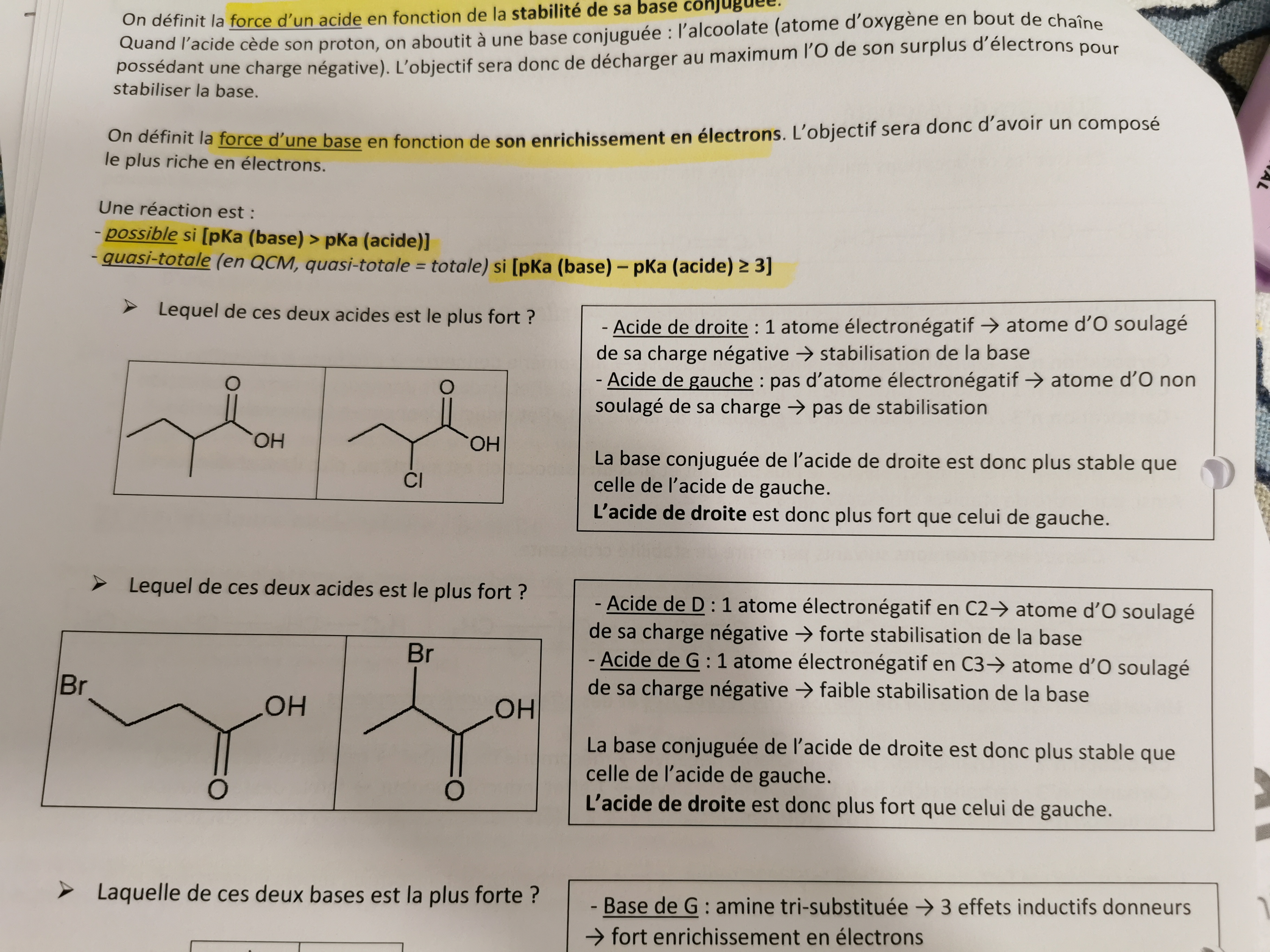 Par exemple, un atome electronégatifs pas trop loin de ton groupement acide va attirer vers lui les électrons donc rendre le groupement moins négatifs et plus stale (comme avec le Chlore dans la ronéo).