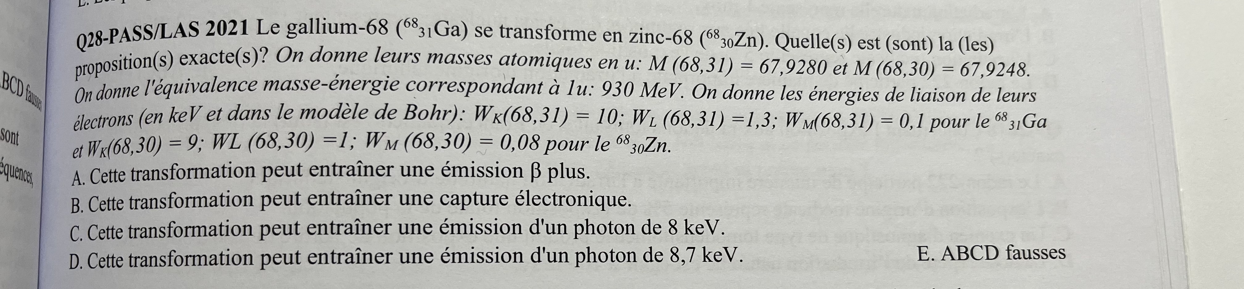 Pour le C on a utilisé les énergies de liaison du fils, donc un électron qui passe de L vers K on aura un photon de 8kev (9-1). Mais pour le père aussi non ? Étant donné que 10-1,3=8,7 ? Ou c’est que le fils ?