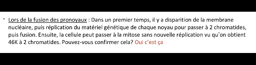 « On va avoir une phase S de réplication de l’ADN après disparition de la membrane nucléaire CAR on n’a pas suffisamment de matériel pour pouvoir passer une division cellulaire classique » -> compté vrai