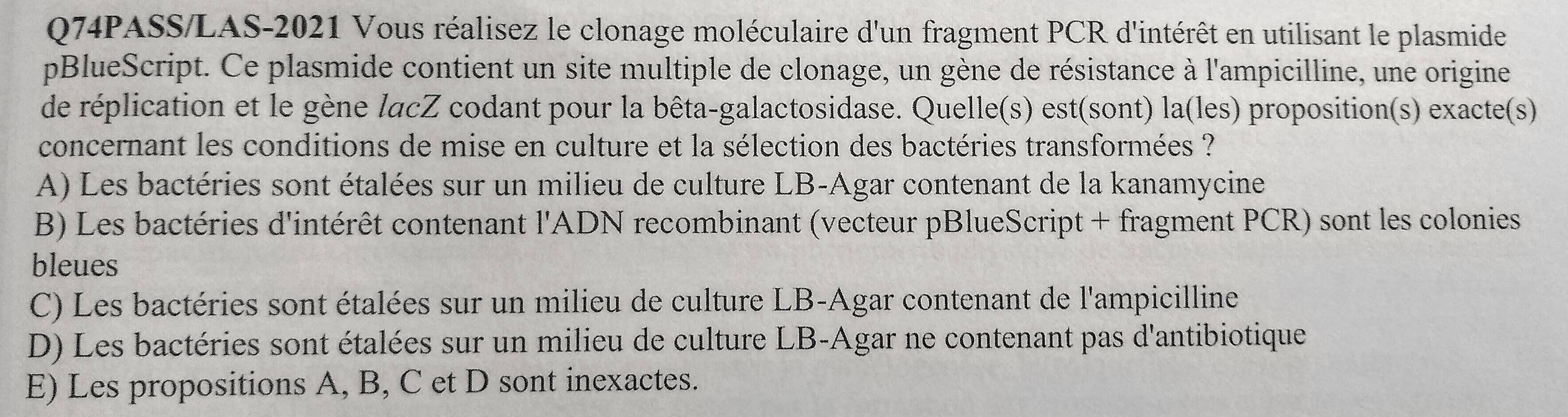 j'imagine que la khanamycine est un antibiotique, item WTF on en parle ni dans le cours ni dans l'énoncé. Si c'est bien un antibiotique, on nous dit dans l'énoncé que le plasmide à une résistance à l'ampicilline et pas à la khanamycine