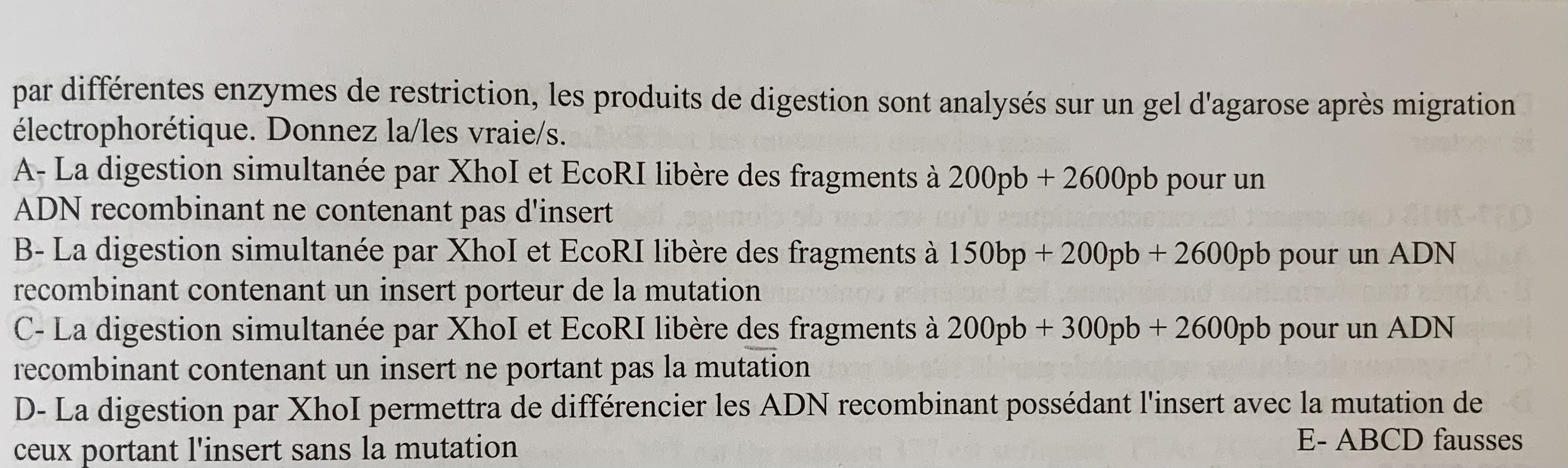 Hello je sais que la co du QCM avait été demandée a la prof l’année derniere mais les items avaient été un peu modifier (sûrement pour pas qu’elle capte que c’est un item d’annale mdrr) mais ducoup est-ce qu’elle piege sur le « des » fragments, genre pour la A y’a des fragments de 200pb (2) et 1 de 2600pb ducoup on le compte juste ou faut vraiment que l’item disent des fragments de 200pb + 200pb + 2600 pb pour le compter vrai