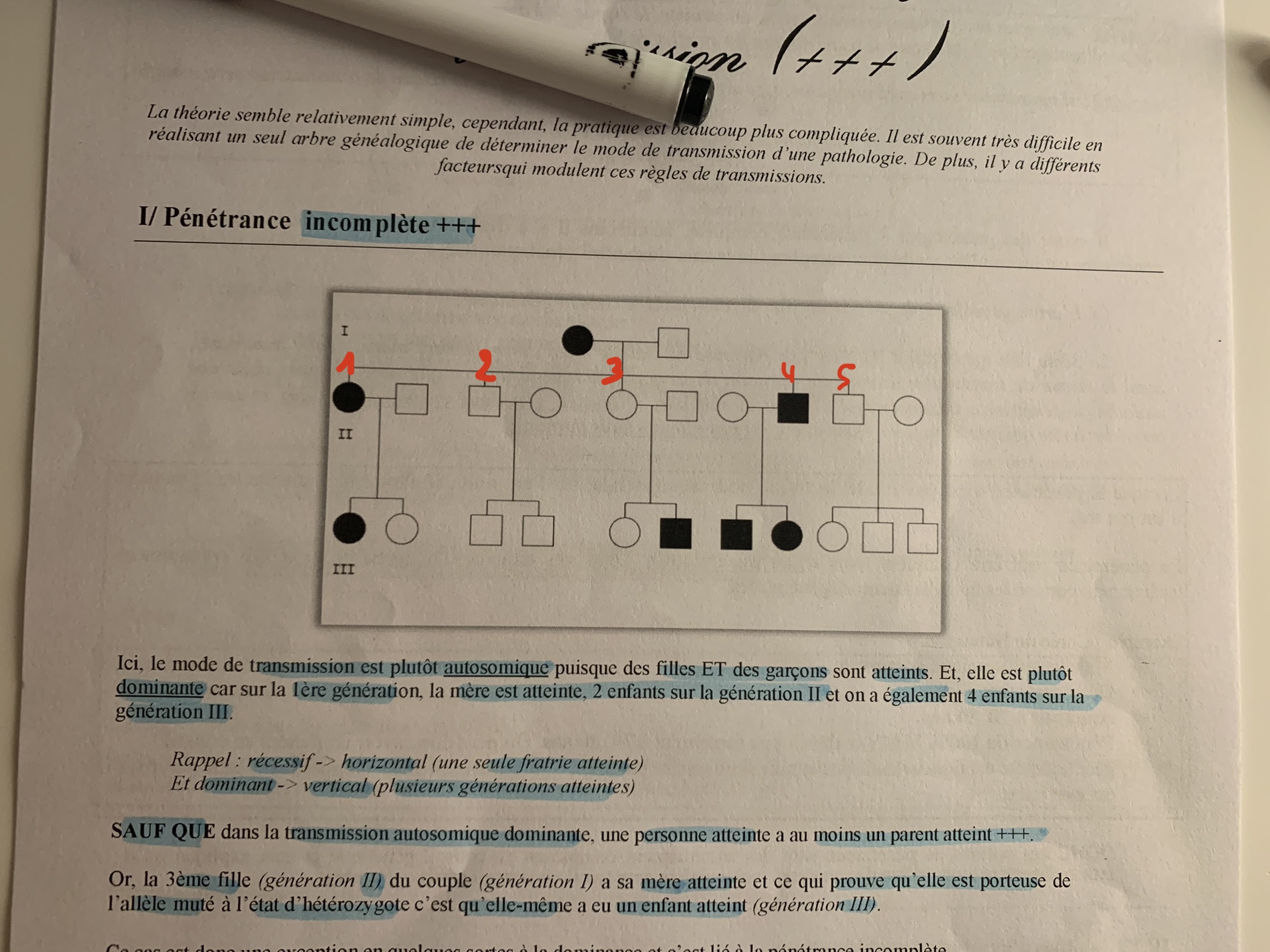 La pénétrance incomplète c'est lorsque, pour une maladie autosomique dominante, on se retrouve avec une personne NON MALADE alors qu'elle est porteuse de l'allèle muté.
