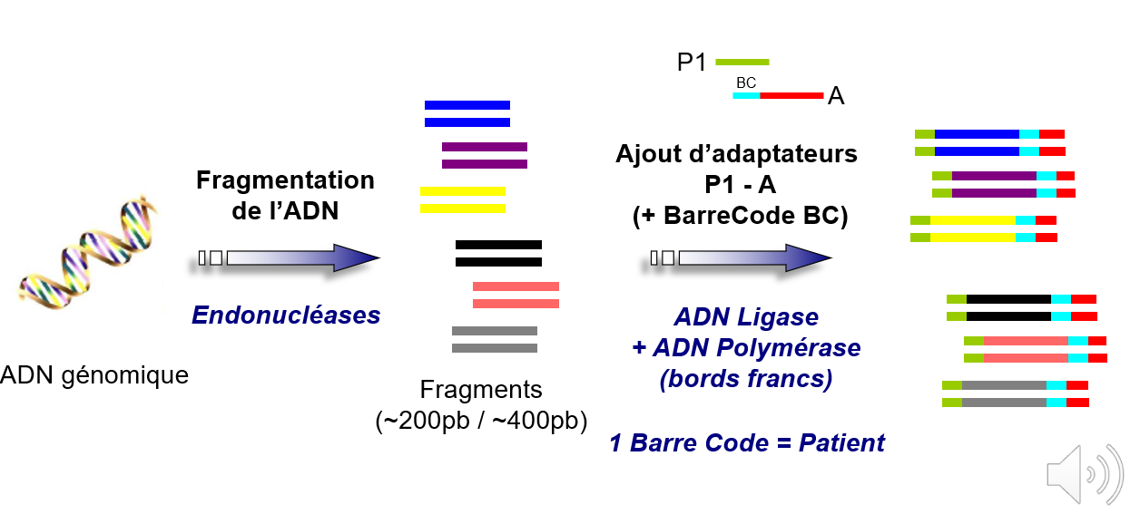Ce qu’il faut surtout retenir c’est qu’après fragmentation et ajout des adaptateurs avec un seul couple de primers il sera possible d’amplifier l’ensemble des fragments d’ADN.C'est bon pour toi ?