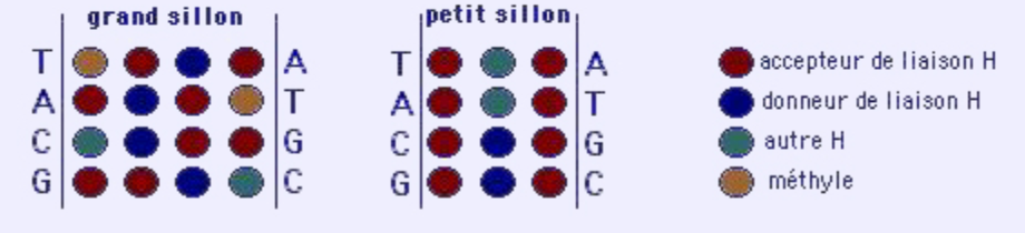 Pourquoi est-ce que le sillon mineur Adénine/Thymine est le seul à n'avoir que 2 "accepteur/donneur" dans la séquence alors que tous les autres en ont 3 ?