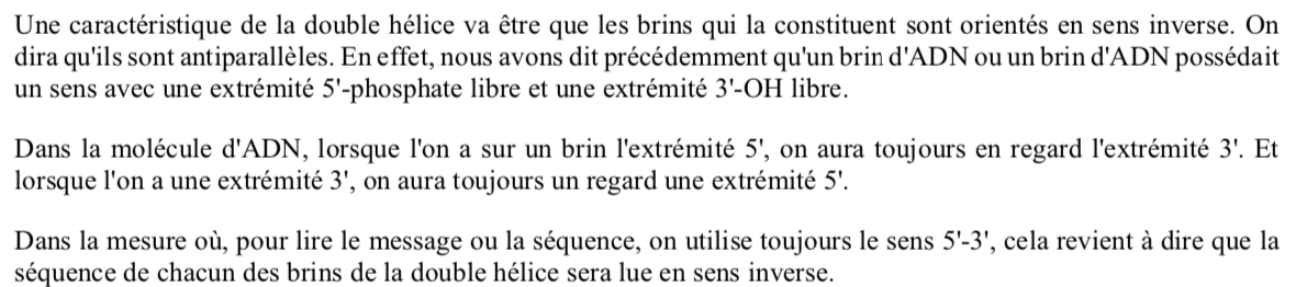 d.Chaque brin de la double hélice d’ADN est lu en sens inverse