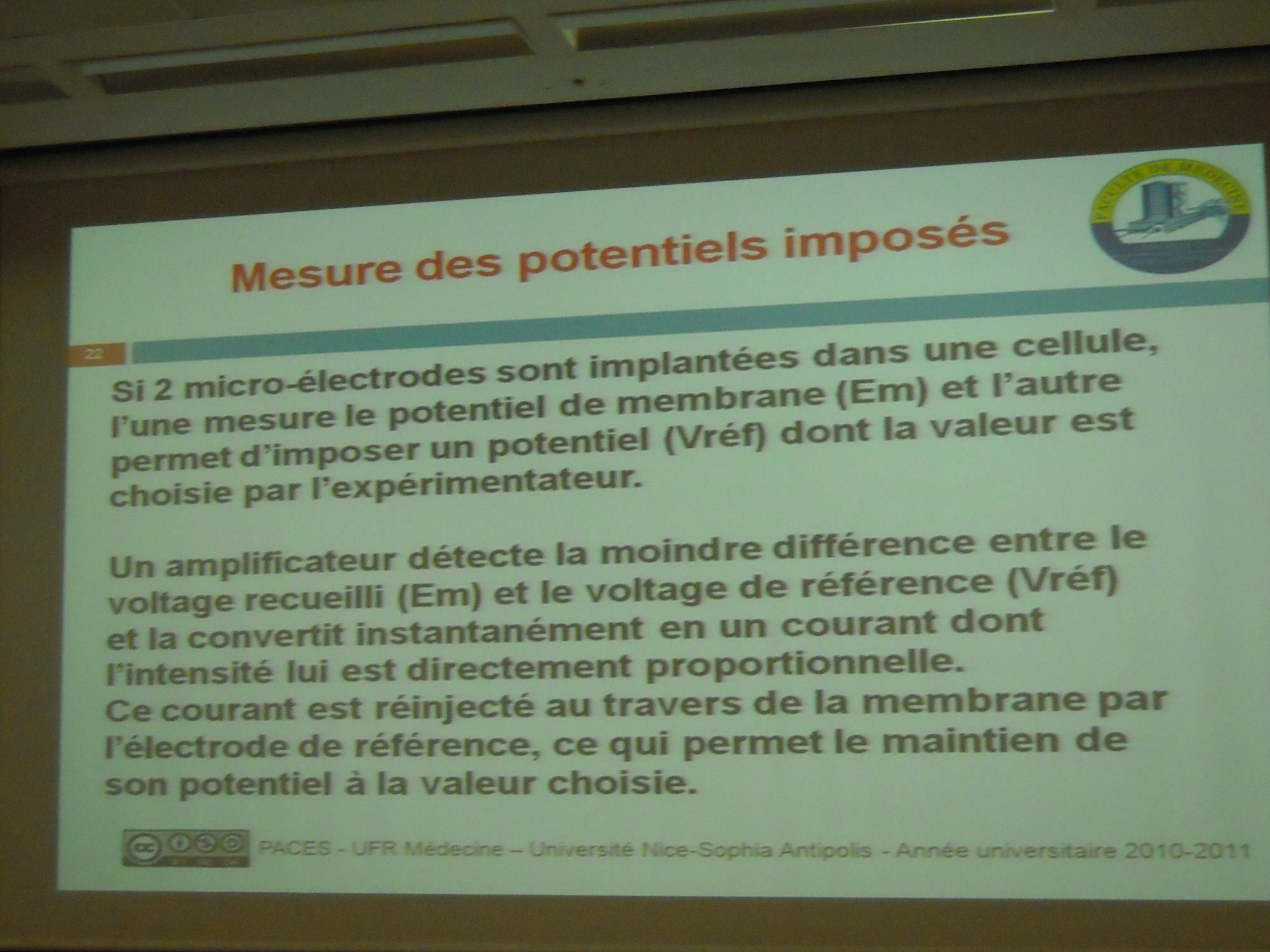 Si un courant ionique apparait dans la cellule, le potentiel de membrane est maintenu constant si un courant de même amplitude mais de sens opposé est injecté par l’électrode 2.