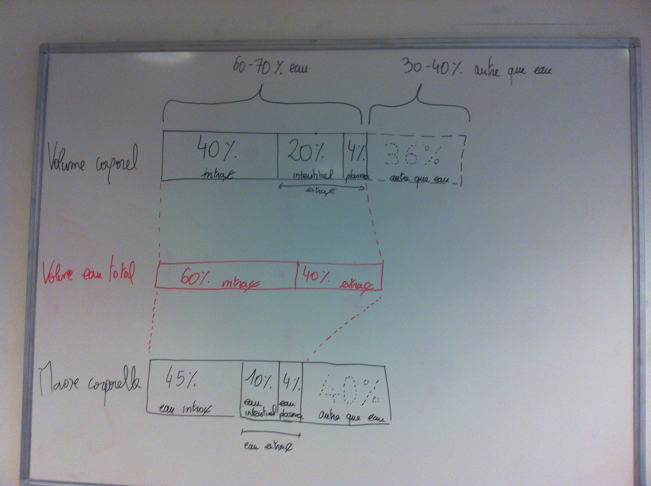 Que l'intracellulaire est le plus grand compartiment : 40-45% du volume total = 60% du volume d'eau (facile, 6x7 = 42; en gros t'apprends le pourcentage d'eau dans le corps, la répartition de l'eau, et tu trouves le pourcentage d'eau par rapport au volume total grâce à un petit produit en croix :) ).