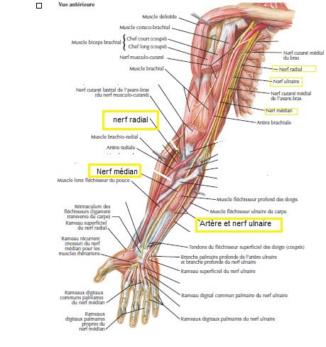 Est ce que c'est possible d'avoir un recap de par ou passe les nerfs radial, ulnaire et médian stp ?