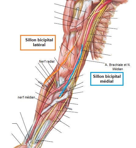 Il me semble que le nerf radial passe dans le sillon de l'humerus (gouttière radiale) mais il est dit après que celui-ci passe dans le sillon bicipital lateral. Quant au nerf médian c'est par le sillon bicipital median ? Quand est il du nerf ulnaire ?