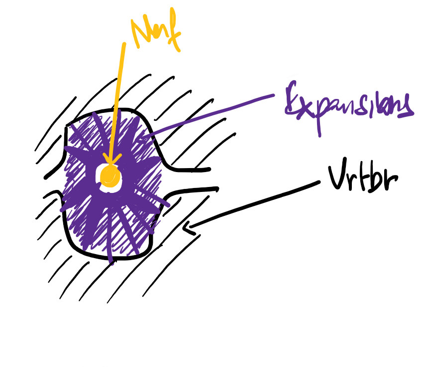 Voici un schéma bien patatoïde. Imagine ici que nous sommes sur une vue postérieure et que j'ai fait un coupe dans le plan frontal. On voit les pédicules vertébraux sectionnés et entre eux les FIV.