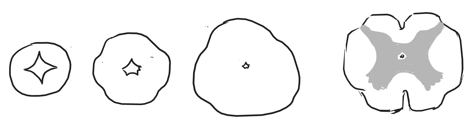 L'axe nerveux mature, et dans sa forme finale, il ne reste que quelques vestiges de ce trou, de ce canal réel qui centrait le tube neural. Dans la moelle il disparait complètement pour laisser place au canal médullaire ou épendymaire (car tapissé d'épendymocytes, voir histo pour plus de détails), ce canal central de la moelle est dit virtuel car en situation physiologique il est invisible, c'est un peu comme si le canal était écrasé par les structures autour. Je t'ai fait un schéma qui représente l'évolution de la moelle pour que tu comprennes :