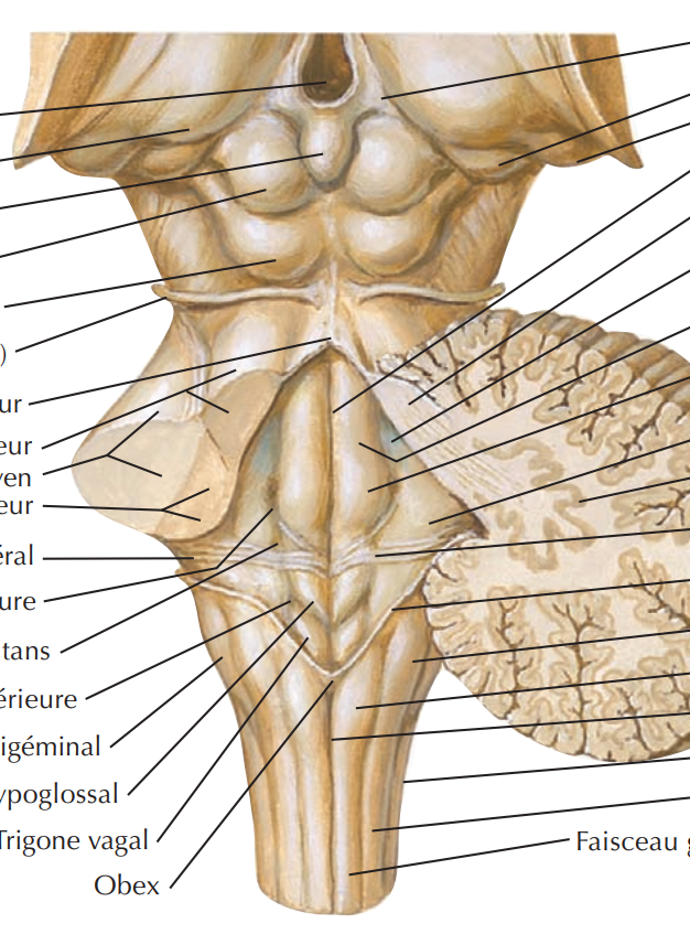 Ah d'accord, je vois mieux ce que tu veux dire. Mais ça n'est pas ça. C'est à dire que le sulcus limitans ou sillon latéral, ce sont les sillons qui séparent les colonnes motrices des colonnes sensitives. Les frontières du losange, le Pr ne les nomme pas en cours. En fait ça pas vraiment un sillon, il faut que tu imagines que en arrière du plancher se trouve le V4 qui prend appui vers l'avant sur son plancher. Et derrière le V4 le cervelet, si tu as l'impression de voir un sillon sur les limites du losange c'est une uniquement parce que l'on a disséqué le cervelet :