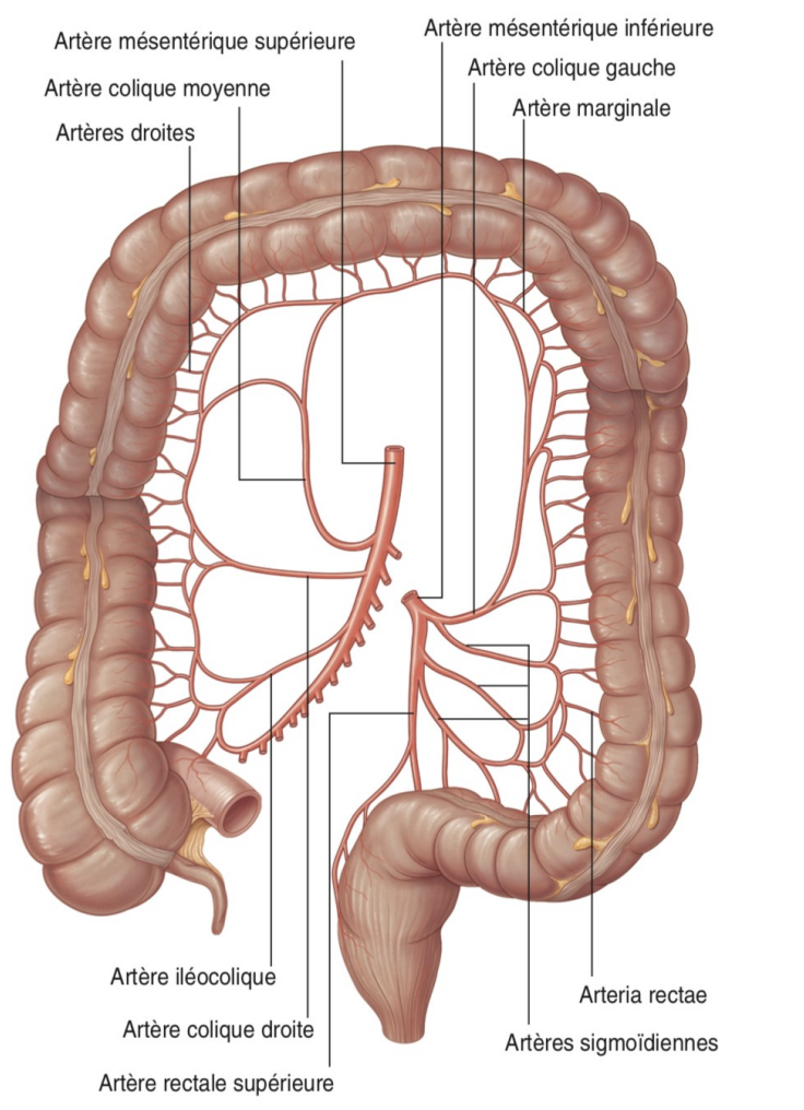 Au niveau droit, c'est le prolongement de l'arcade bordante du colon, mais on parle d'arcade DE RIOLAN uniquement entre la colica media (dernière branche de l'AMS ) et la colique angulaire gauche (premiere branche de l'AMI)