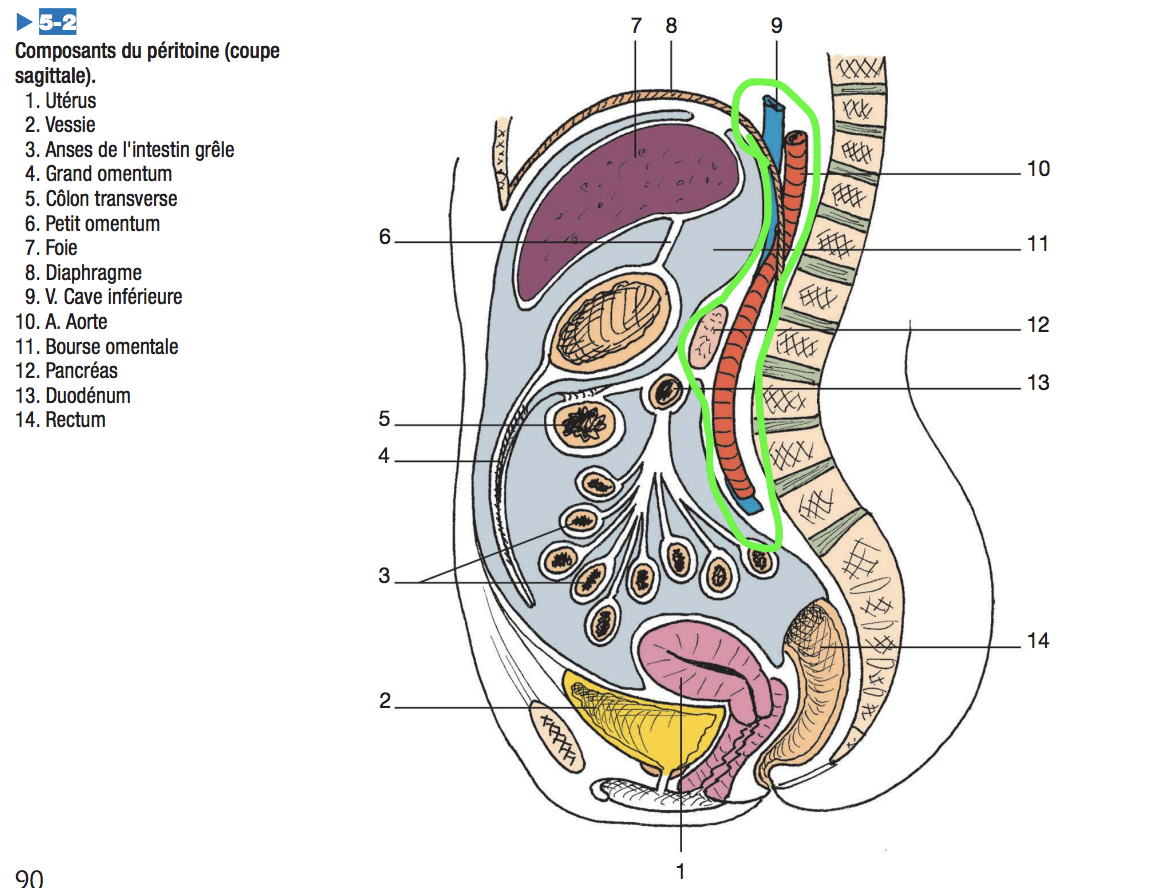 reins Voici un schéma avec tout ce qui est dans le bleu en intra-péritonéal, et tout ce qui est entouré en vert en rétro-péritonéal