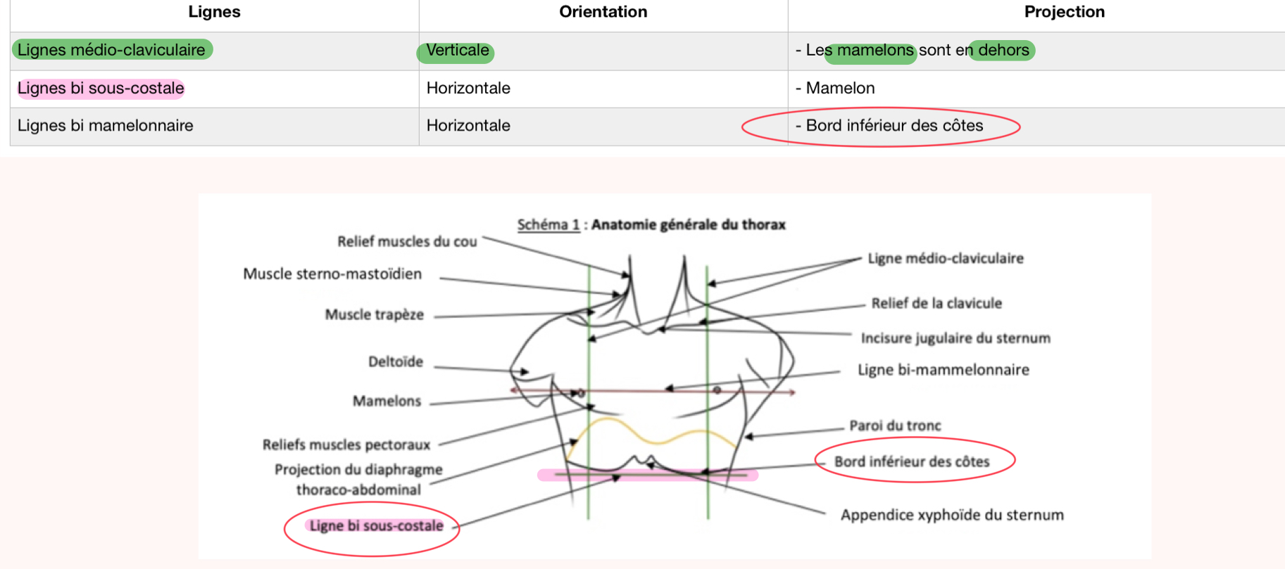 On dit dans le tableau que la ligne bi sous-costale est projetée via les mamelons mais c’est pas plutôt grâce au bord inférieur des côtes comme on le voit sur le schéma ? Ça serait + logique aussi par rapport au nom 😅