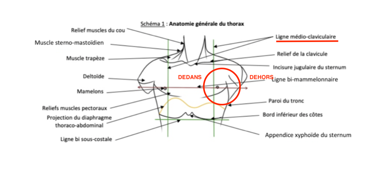 °la ligne medio-claviculaire passe en DEHORS des mamelons (ça c écrit ds la fiche) et que