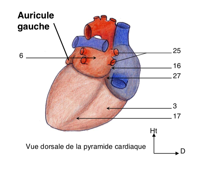Dans la ronéo, il est dit que l'auricule gauche est visible en vue antérieure, comme sur les représentations schématique, l'auricule gauche n'est presque représenté que sur des vues antérieures