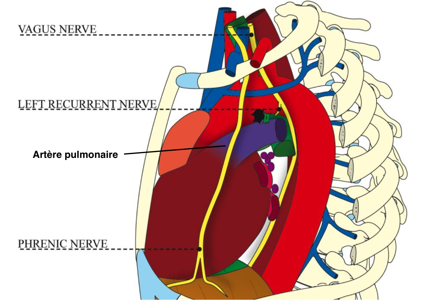 Dans la fiche il est marqué que la nerf phrénique gauche longe l’artère pulmonaire mais sur certains schémas j’ai l’impression qu’il ne la longe pas vraiment. Est-ce qu’il s’agit d’un contact avec l’artère pulmonaire gauche et pas le tronc pulmonaire (commun) sachant que le nerf phrénique est en contact avec la crosse aortique.