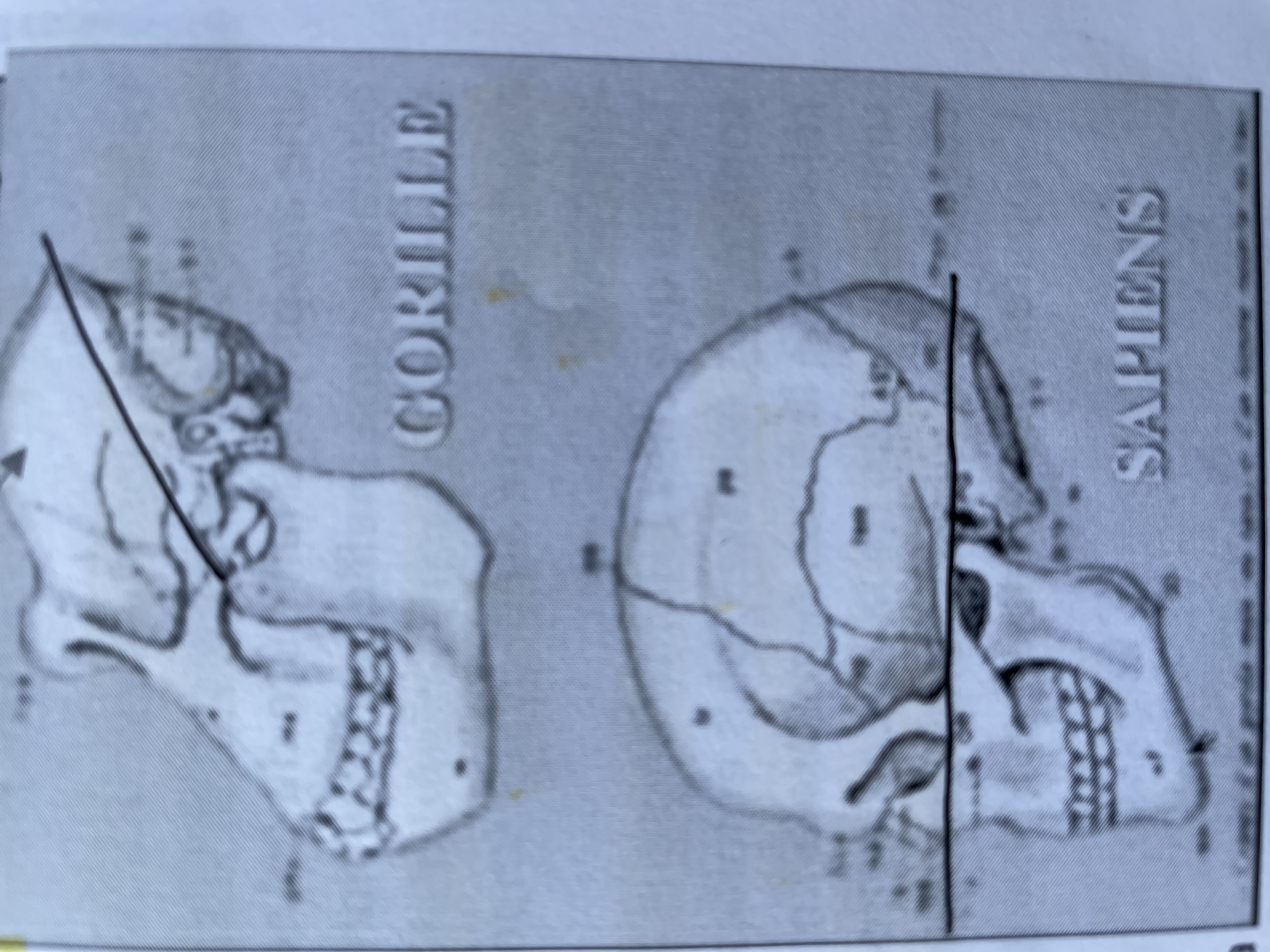 En regardant ce schéma, fixe le trou occipital, tu vois que chez le singe il est dans un plan qui est à ~45° par rapport à l'horizontal alors que chez l'homme il dans le plan horizontal. Fixe maintenant la partie postérieure du corps du sphénoïde, celle ci est à peu près à 45° de l'horizontal chez le singe alors qu'elle est à 90° chez l'homme.