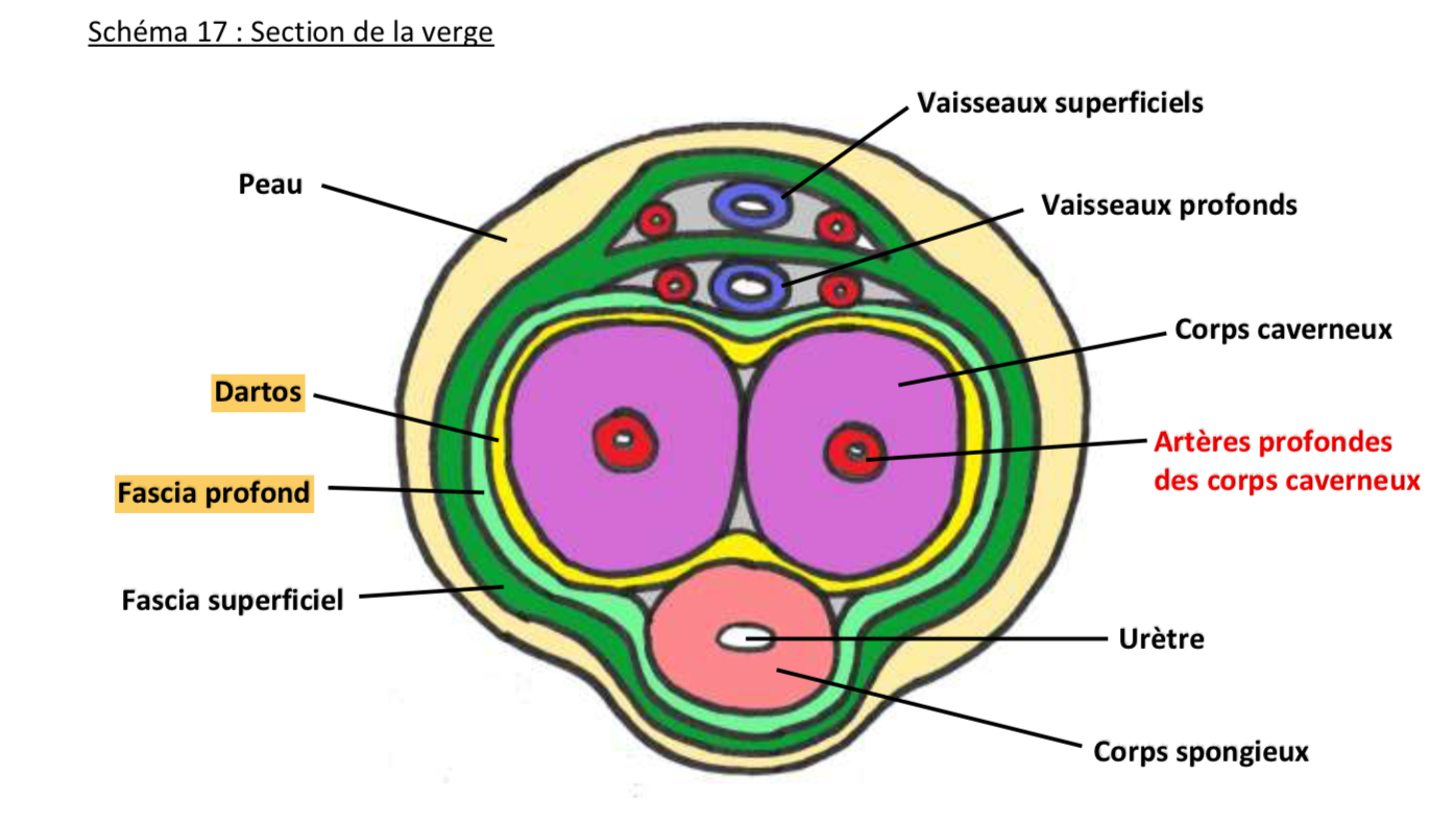 2 corps caverneux > Dartos > Fascia profonde > Fascia superficielleDonc si tu dois faire une distinction entre dartos et fascia profonde, c'est que le