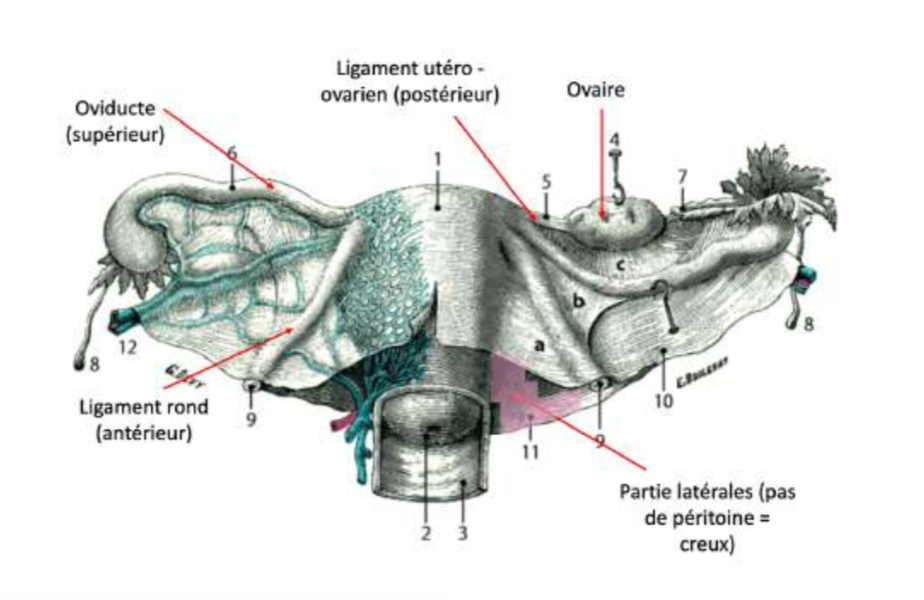 :arrow: Une grande partie de l'utérus est recouvert de péritoine (partie inférieure /sup). Trois éléments (oviductes / ligament rond / ligament utero-ovarien) émanent des cornes de l'utérus. Comme le péritoine recouvre une grande partie de l'utérus, les éléments qui émanent de l'utérus vont aussi être en contact avec du péritoine.