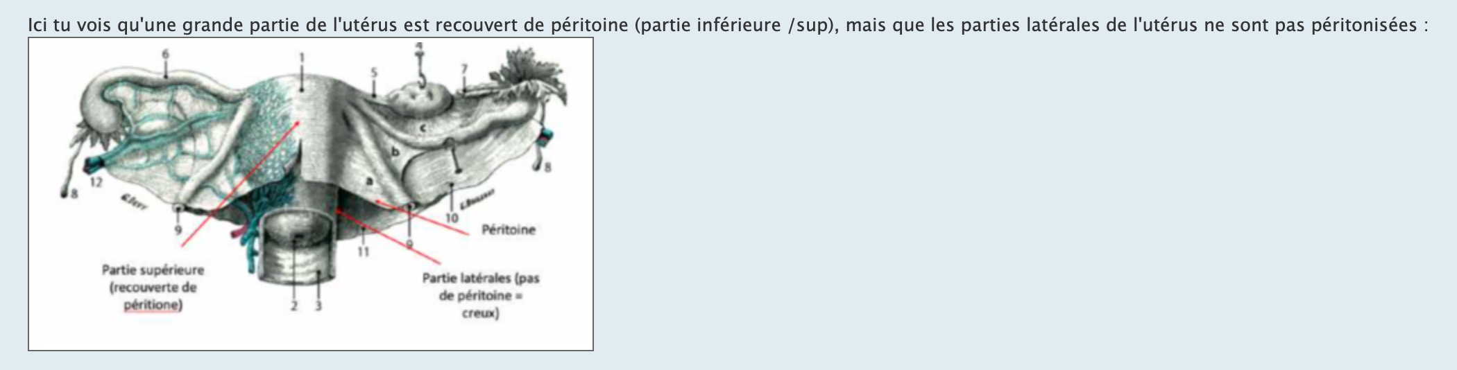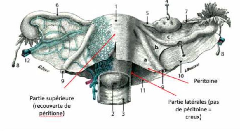Ici tu vois qu'une grande partie de l'utérus est recouvert de péritoine (partie inférieure /sup), mais que les parties latérales de l'utérus ne sont pas péritonisées :