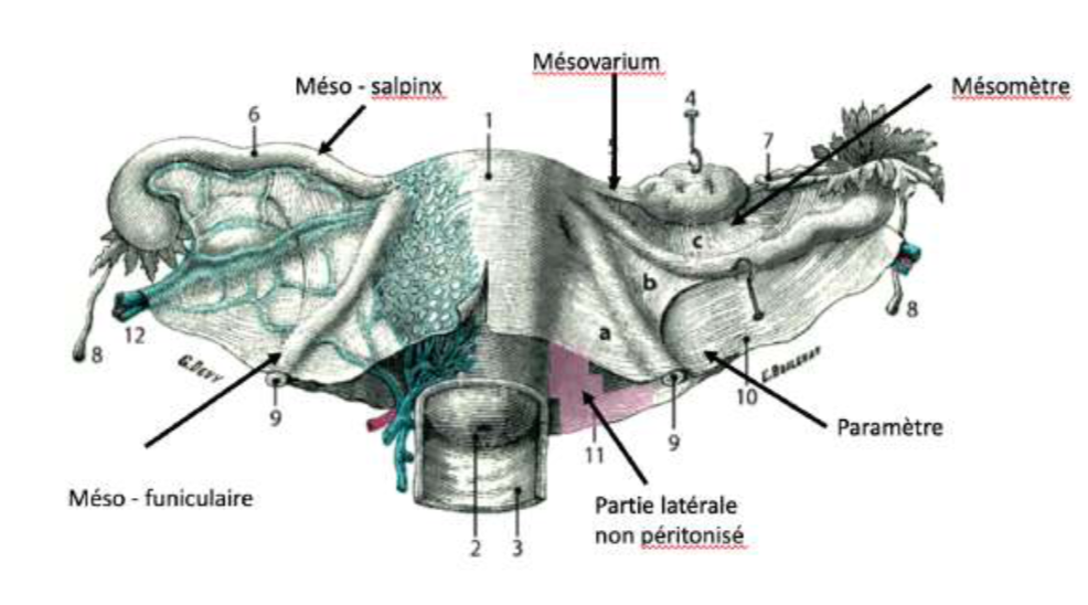 - Le mésomètre = une des parties du ligament large = formation de péritoine