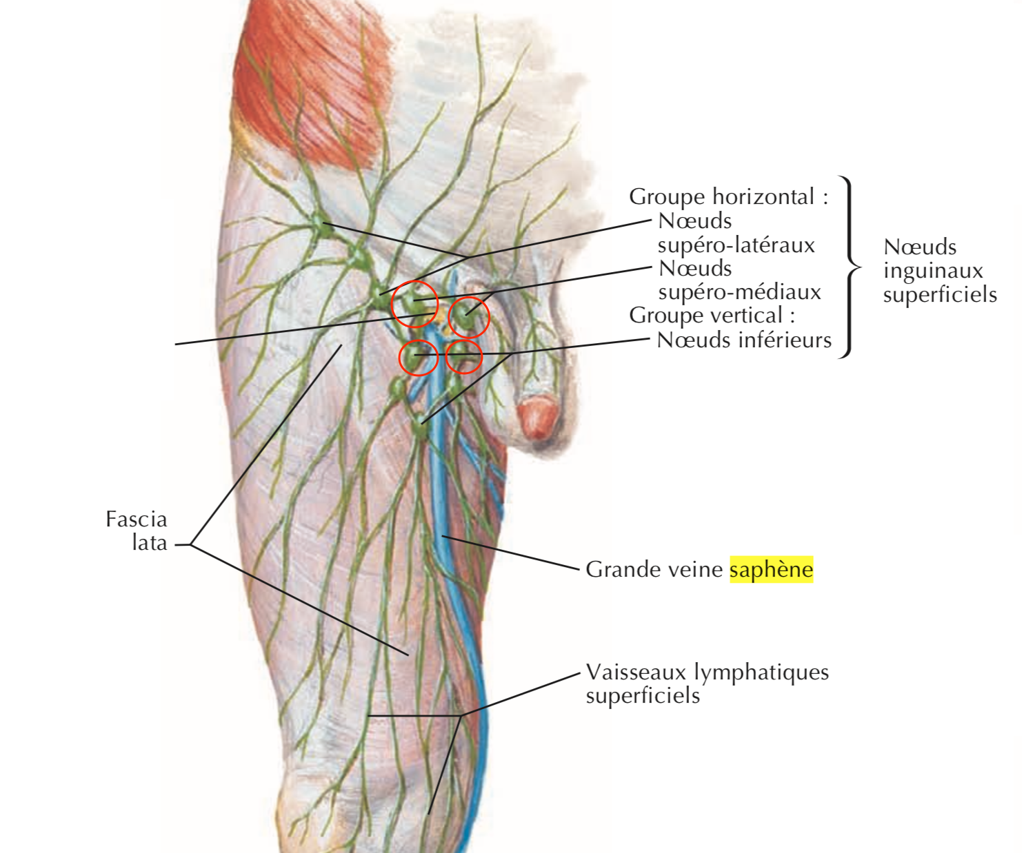 Svp je ne comprends pas cette phrase : " les nœuds inguinaux sont disposés en 4 cadrans: en dehors et en dedans, au - dessus et en -dessous"