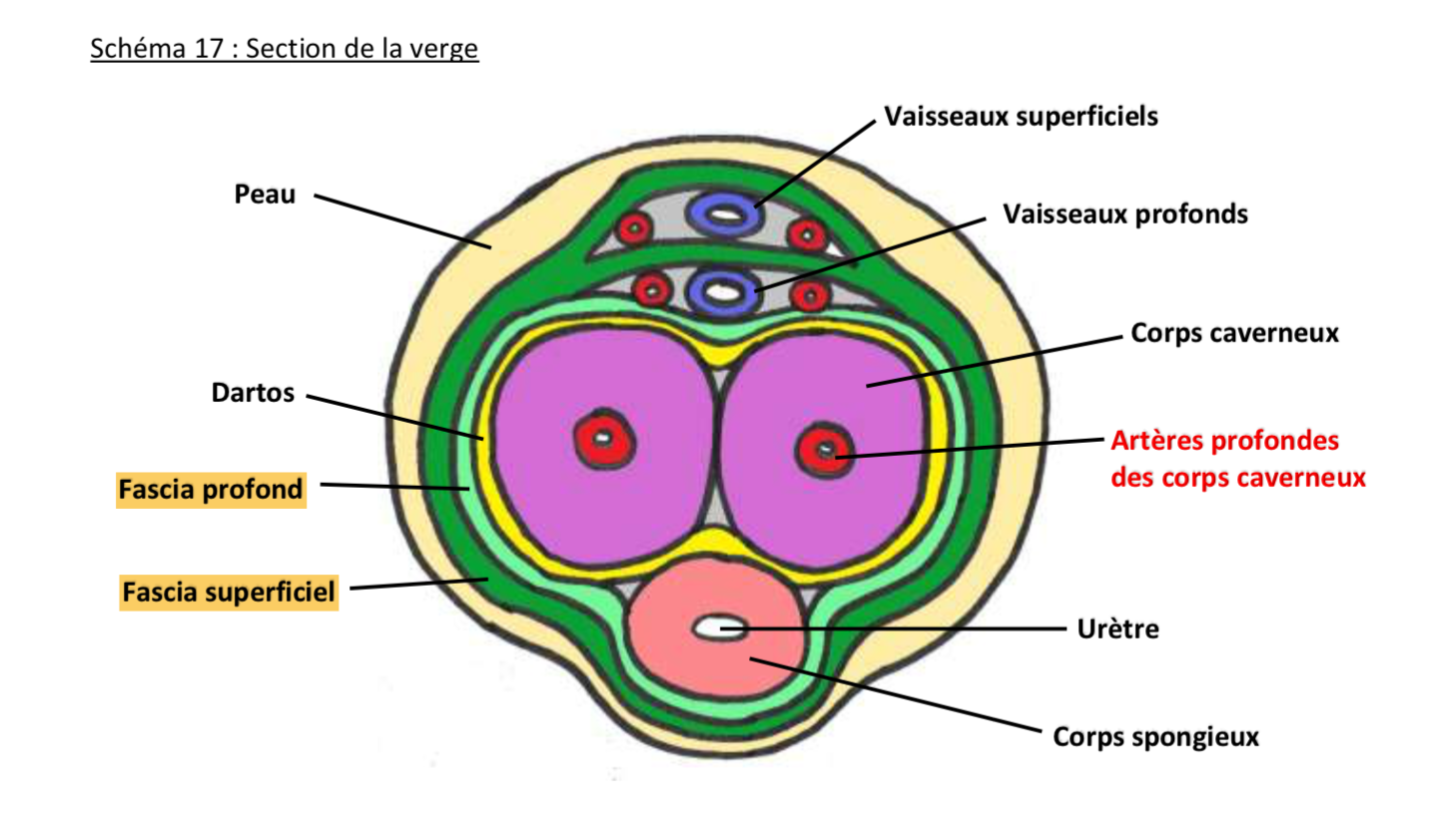 fascia : "Les fascias superficiels et profonds entourent au niveau postérieur de la verge les veines et artères superficielles et profondes du dos de la verge. Donc une pression à ce niveau là entraîne une diminution du retour veineux et donc une augmentation du durcissement des corps caverneux